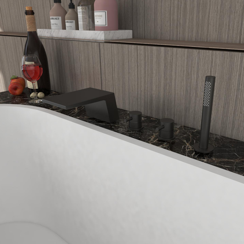 يوفر صنبور حوض الاستحمام تأثيرًا ناعمًا لتدفق المياه بمقبضين يتحكمان في تدفق المياه ودرجة حرارتها.
