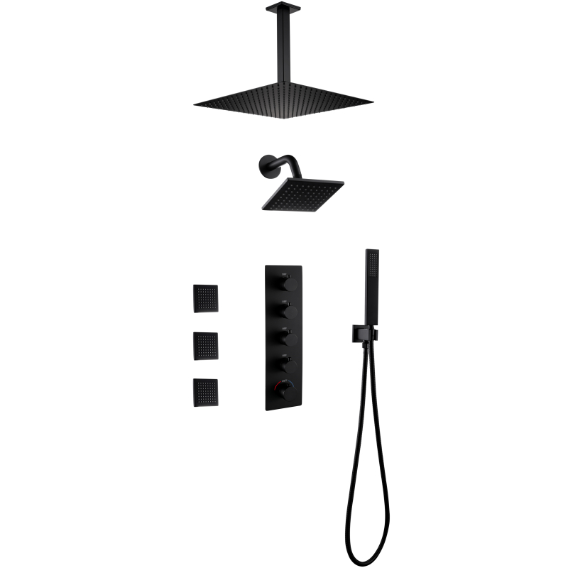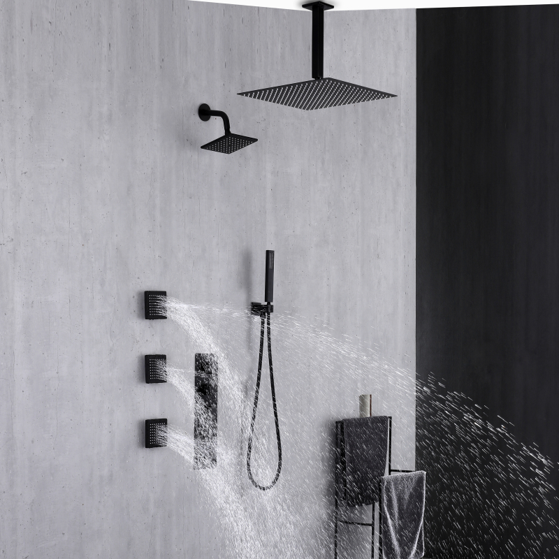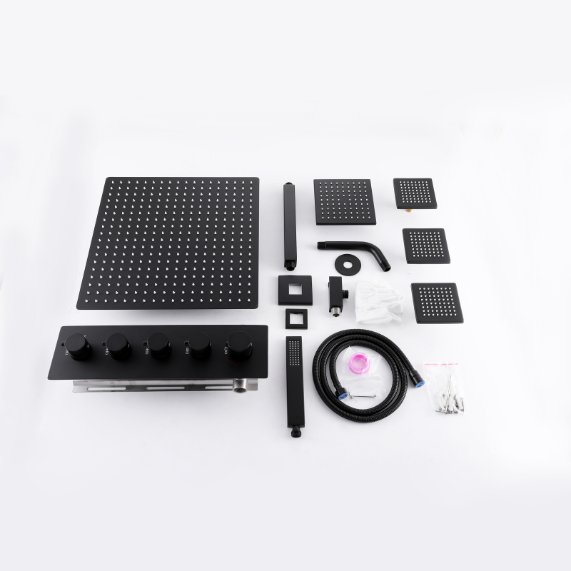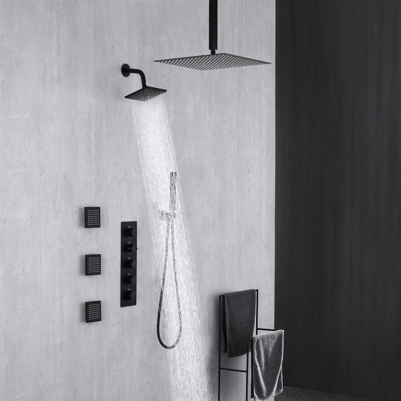 يوفر تأثير خلاط الدش الحراري المخفي دش مريح مع أربع ميزات، رأس دش علوي يمكن التحكم فيه ورأس دش محمول باليد، ورذاذ علوي صغير ورذاذ حائط في الأعلى يمكن تدويره للتحكم في التدفق ودرجة الحرارة.