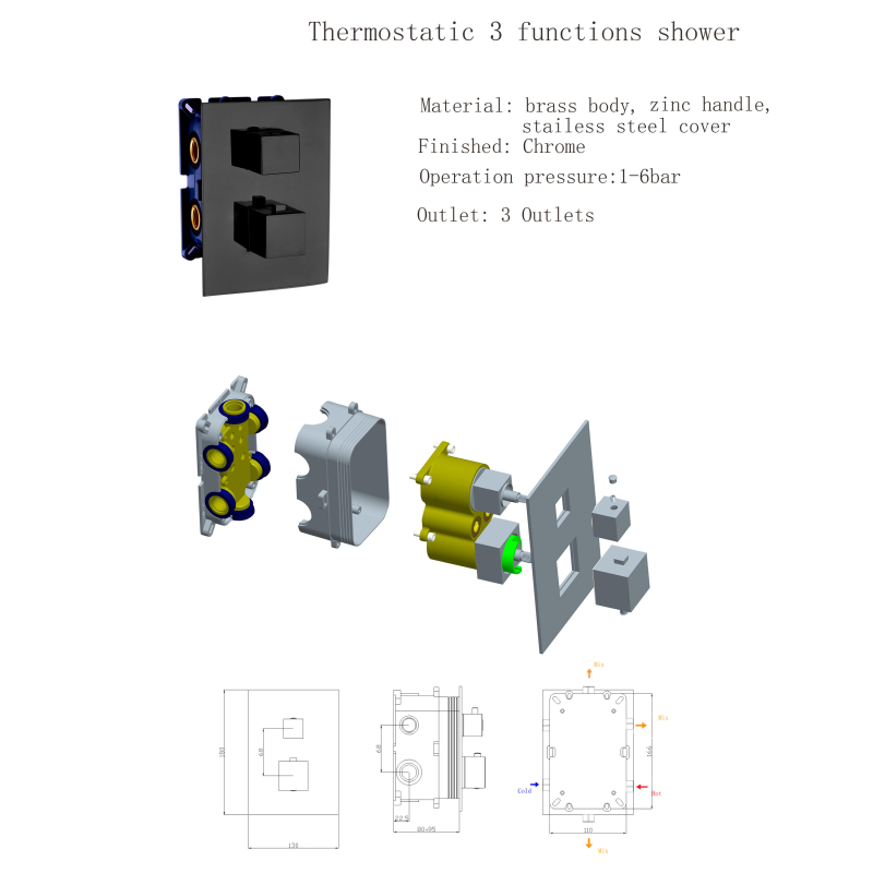 يوفر للحمام خلاط الدش الترموستاتي تأثير دش مريح مع وظيفتين، رذاذ علوي يمكن التحكم فيه ورأس دش محمول باليد، ومقبض واحد، وتحكم اختياري في تدفق ودرجة حرارة الماء.